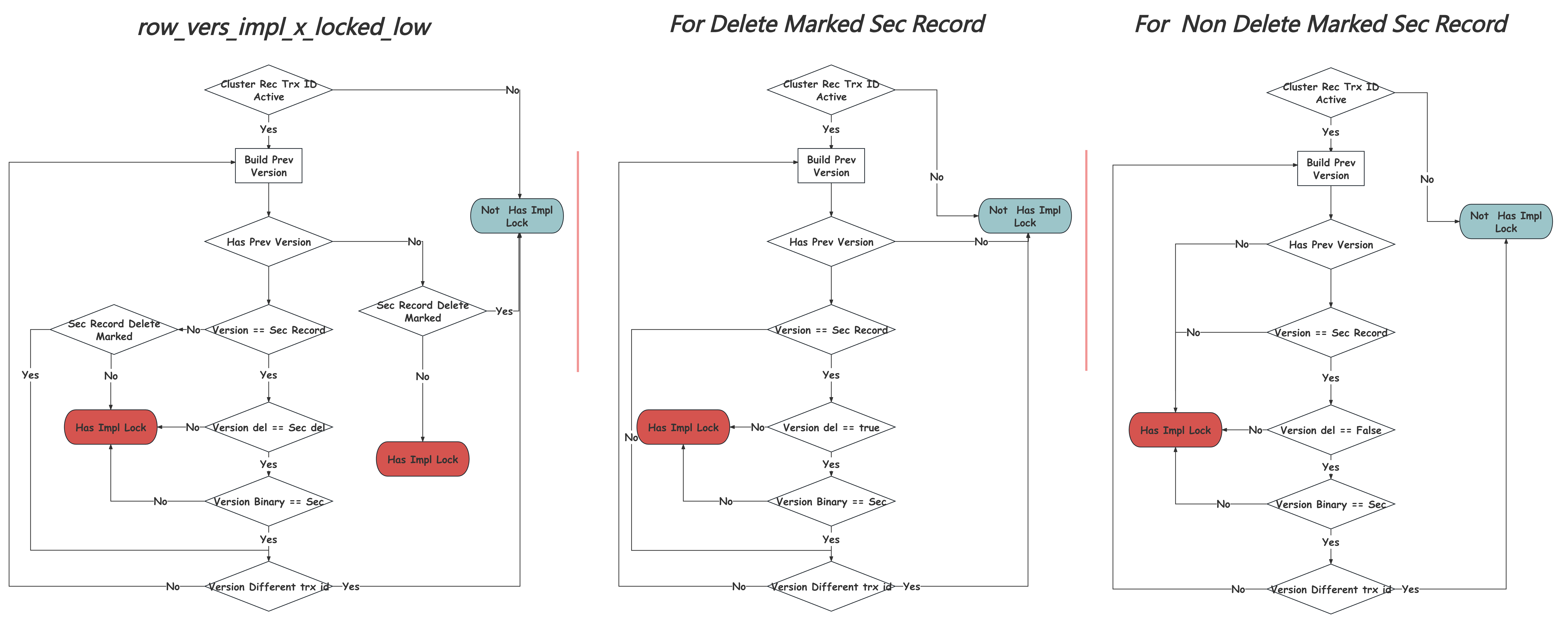 但对于二级索引这个问题会变得复杂很多,因为InnoDB的二级索引上并没有记录对应事务的Trx ID,无法直接判断当前二级索引上的记录是谁写的, 需要回表到对应的主索引上判断,其实就是找当前主索引上对应的记录,如果存在最新的还未提交的事务,有没有可能造成了我们看到的这个二级索引记录的写入。如果有,那么就认为存在隐式锁需要升级成显式锁。简单的讲,这个可能性判断的流程是:定位到对应的主键索引记录, 判断其Trx ID,如果是一个未提交的事务,那么通过Roll Ptr溯源该事务所有在这条Record上的更改,通过比较记录主索引记录和二级索引记录的内容及Delete Mark标记,来做出可能性的判断。这里不再详细展开,只附流程图供参考:Secondary Index Impl Lock。也可以参考Deep Dive into MySQL - Implicit Locks[15]中的相应介绍。